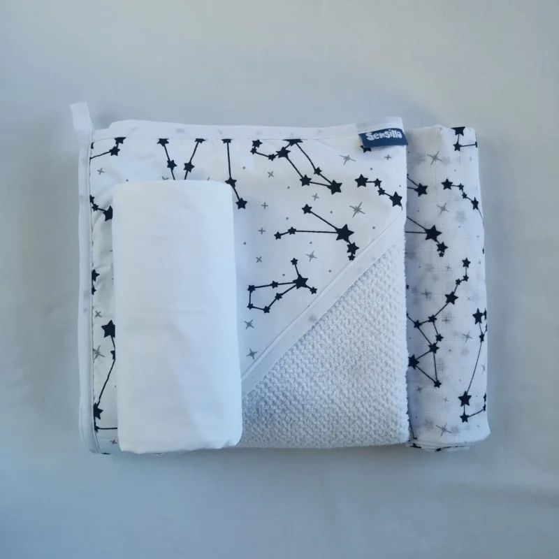 The baby bath towel with hood, in white colour and constellation design on the hood, is made of 100% high quality cotton popcorn terry cloth. The particularly soft fabric, with excellent absorbency is ideal for the daily bathing of the newborn, for infants and toddlers and is particularly durable. The white fitted sheet offers a perfect fit for the crib mattress and safety for the infant, made of 100% high quality cotton. The muslin swaddle, made of premium cotton & hand-sewn, with constellation design to match the baby towel, has a large dimension that makes it suitable for many uses while at the same time offering a sense of peace to the infant.