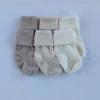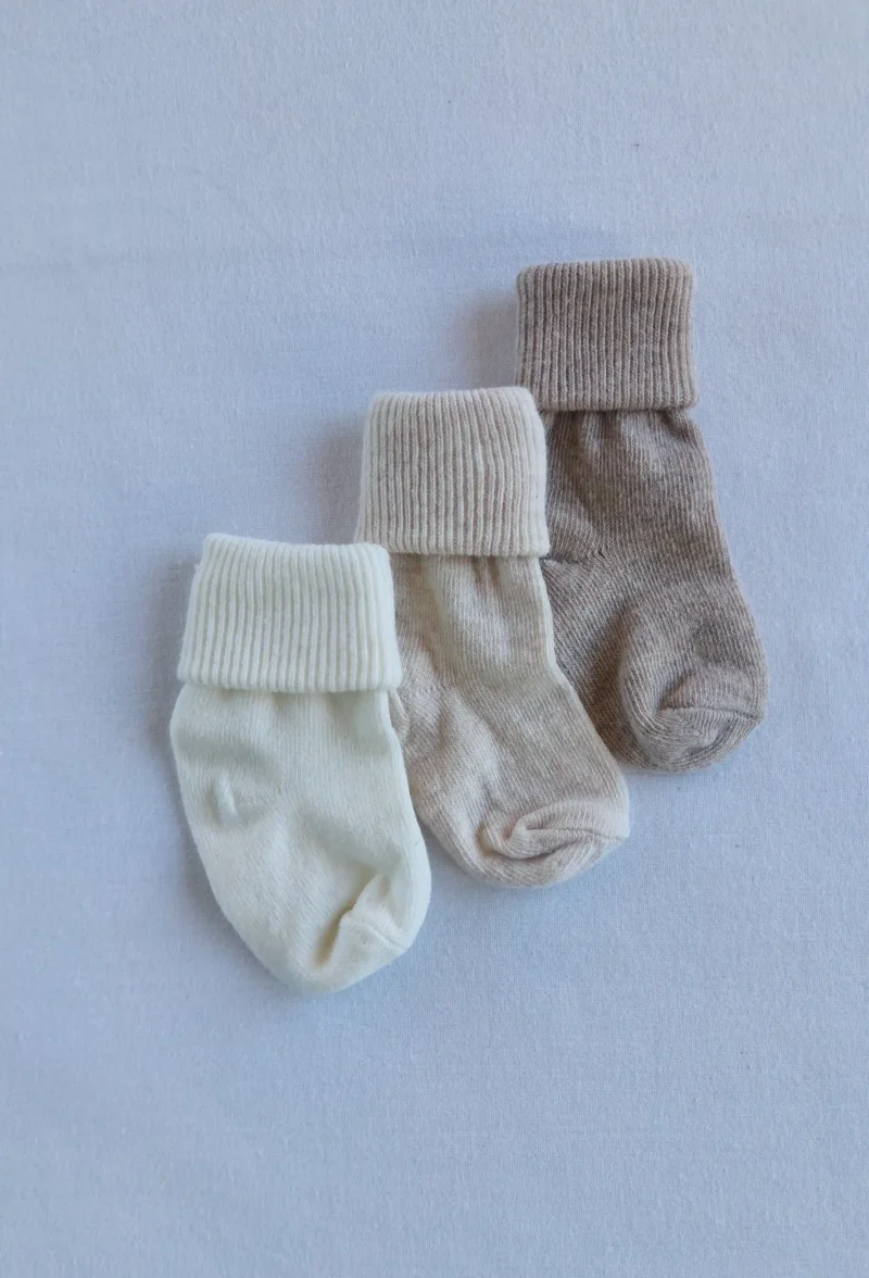 Set of 3 pairs of soft baby socks, long and foldable, for a better fit. Made of cotton-based fabric, according to OEKO-TEX specifications. With a special antibacterial treatment that offers additional protection and hygiene, keeping baby’s feet comfortable all day long. Each pair is solid colour, in a different shade, one pair in white, one pair in beige and one pair in dark beige.