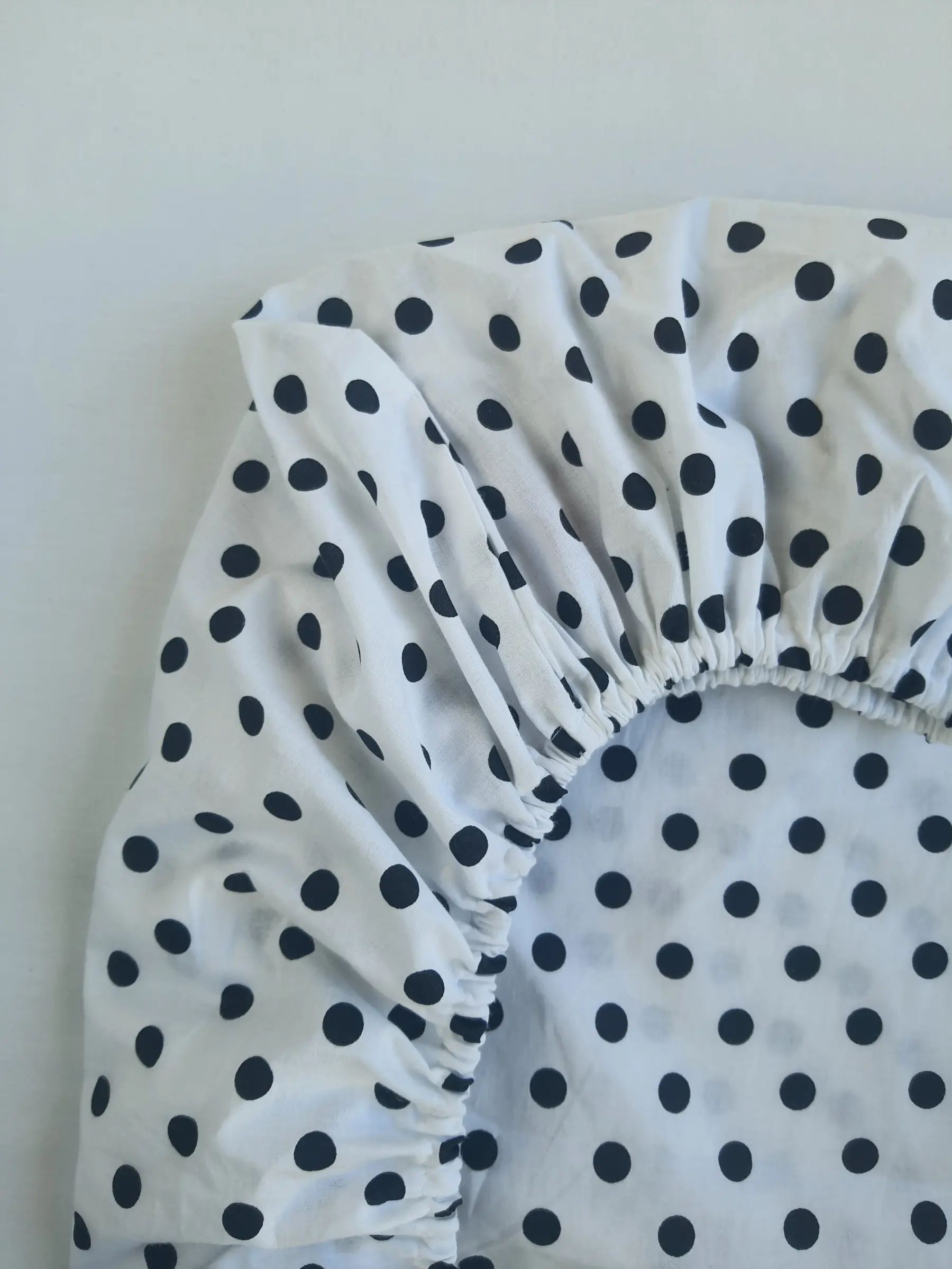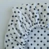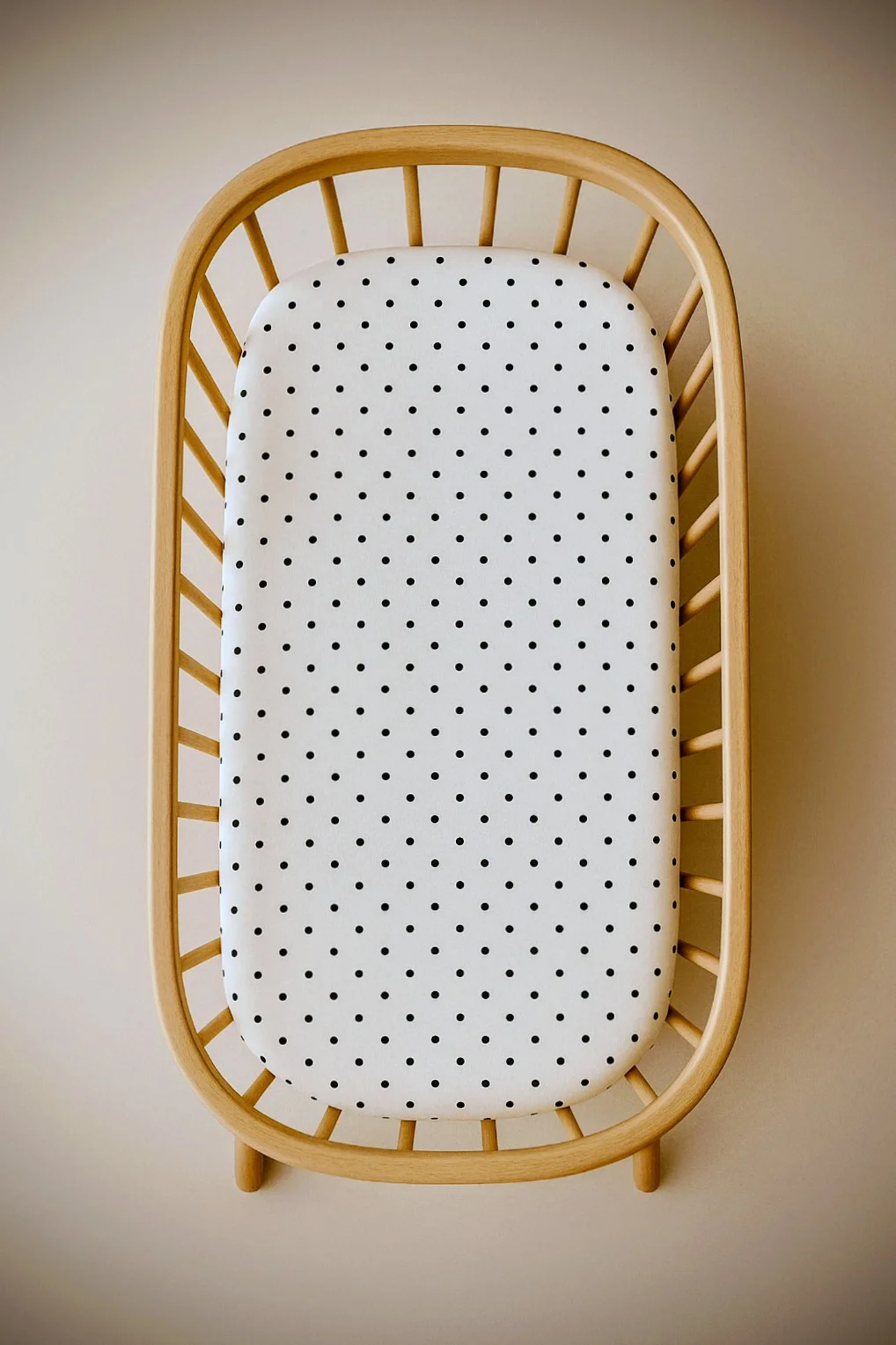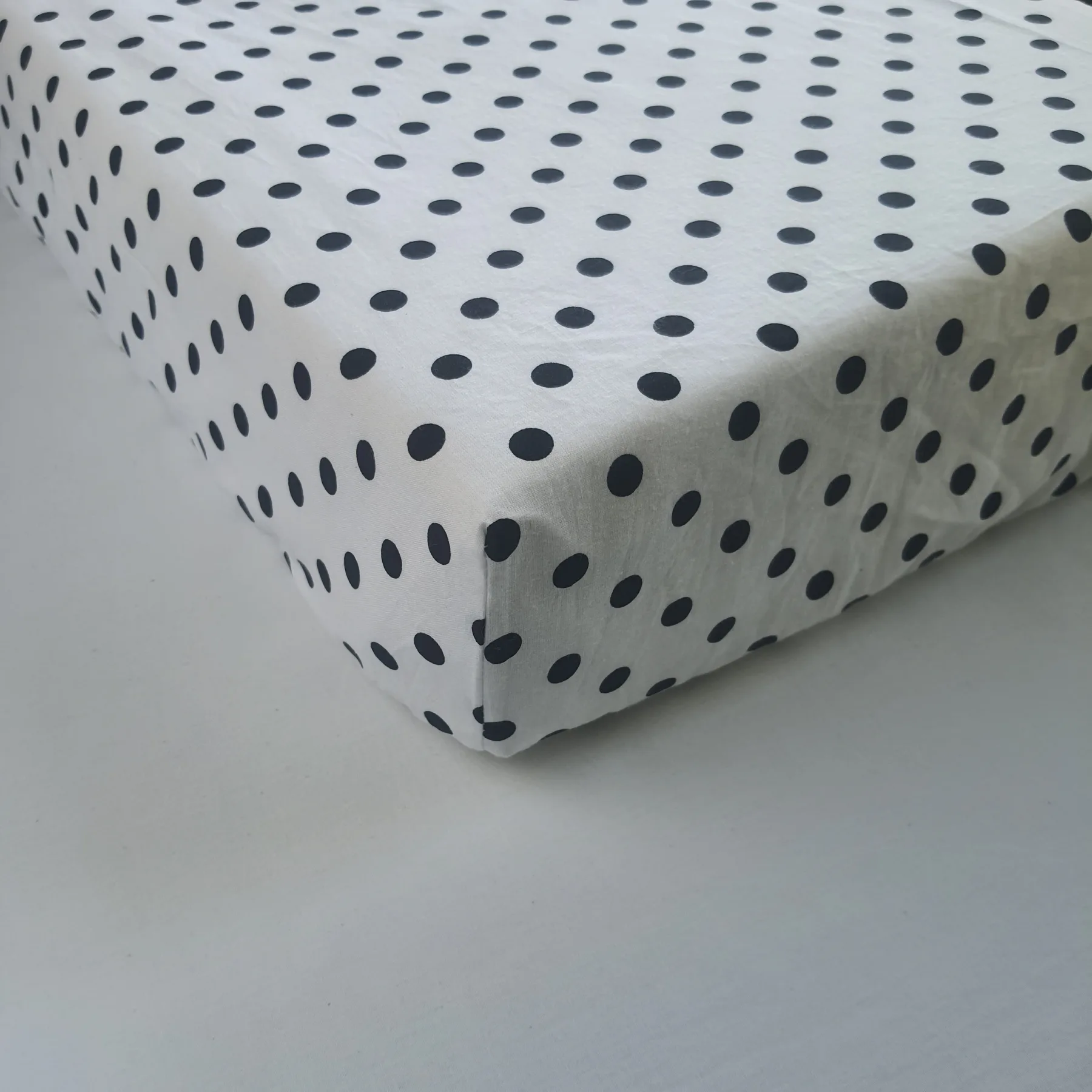Baby crib sheet with elastic band, for a better fit on the mattress, in white with black polka dots. Made of 100% cotton fabric, STANDARD 100 by OEKO-TEX certified, ideal for all seasons as it allows baby’s skin to breathe. It offers a soft texture, excellent durability and comfort. The sheet with elastic band all around fits to the mattress and stays in place during sleep, making your baby’s sleep more pleasant and safe. It is durable and easy to wash and is a practical and elegant gift for all new parents.