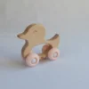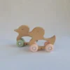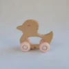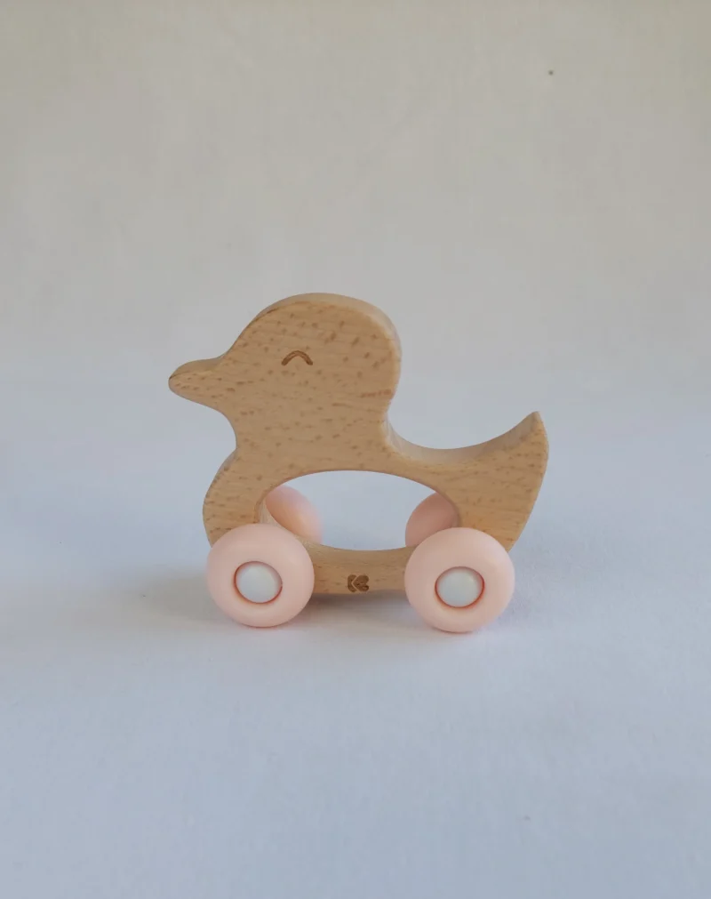 Wooden toy in the shape of a duck, made of natural beech wood, with silicone wheels in pink colour, that can also be used as a teether. Ideal for the sensory development, fine motor skills, visual-motor skills, but also for teething.