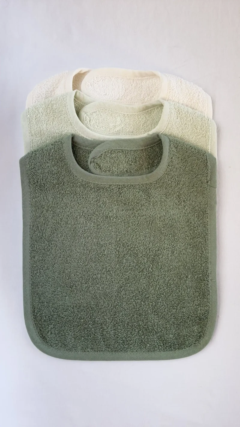 Σετ από τρεις σαλιάρες φαγητού σε μεγάλο μέγεθος, για να είναι πιο πρακτικές και να προσφέρουν μεγαλύτερη προστασία από λεκέδες. Κατασκευασμένες από 100%βαμβακερό πετσετέ ύφασμα, ώστε να είναι πιο απορροφητικές αλλά και να στεγνώνουν εύκολα, με πιστοποίηση STANDARD 100 by OEKO-TEX. Ιδανικές για καθημερινή χρήση από τα πρώτα γεύματα του μωρού μέχρι και τα νήπια. Με κλείσιμο αυτοκόλλητο βέλκρο στο πίσω μέρος. Κάθε σαλιάρα είναι μονόχρωμη, σε διαφορετική απόχρωση, μία σε λευκό, μία σε πράσινο και μία σε μέντα χρώμα.