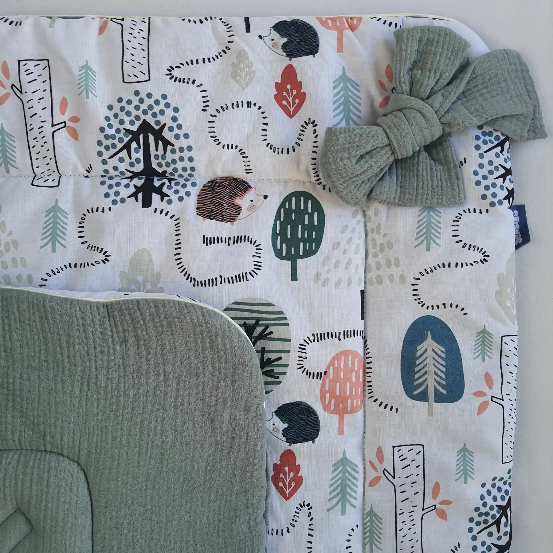 Βρεφικός υπνόσακος νεογέννητου φάκελος, με εσωτερικό και διακοσμητικό φιόγκο από μουσελίνα. Ιδανικός για νεογέννητα και βρέφη. Κατασκευασμένος από 100% βαμβακερό ύφασμα εξωτερικά, 100% βαμβακερή μουσελίνα εσωτερικά, και γέμιση από αφράτο, μη υφαντό, ύφασμα σιλικόνης. Εύκολο κλείσιμο με velcro για μεγαλύτερη ευκολία. Ο υπνόσακος φάκελος αγκαλιάζει απαλά το σώμα του μωρού προσφέροντας αίσθηση ασφάλειας και ζεστασιάς. Μπορεί επίσης να χρησιμοποιηθεί ανοιχτός σαν παπλωματάκι ή χαλάκι δραστηριοτήτων. Πολύ πρακτικό και για δώρο νεογέννητου, αφού είναι απαραίτητο και χρήσιμο για όλους τους νέους γονείς. Η μουσελίνα είναι σε χρώμα μέντα και το εξωτερικό σε λευκό χρώμα με σχέδιο σκαντζόχοιρο.