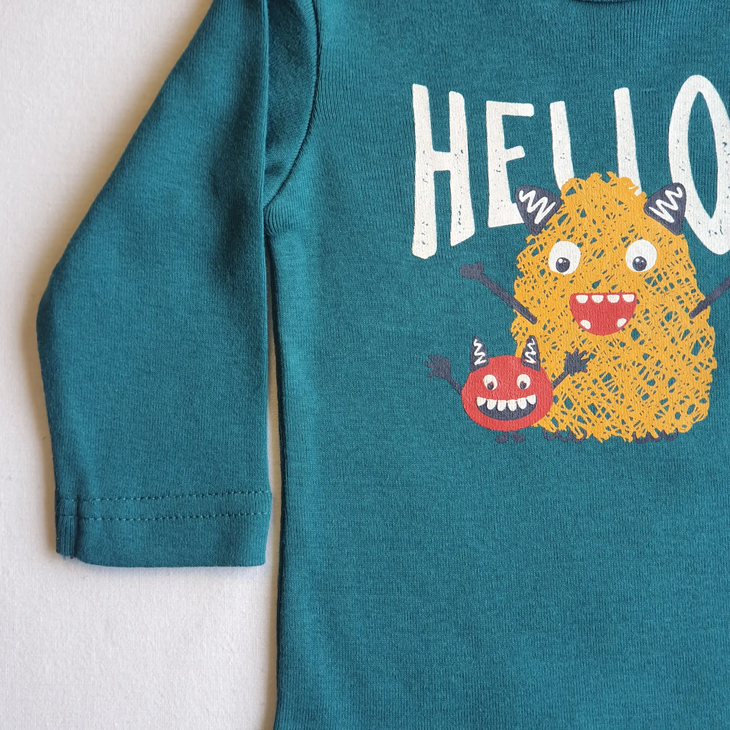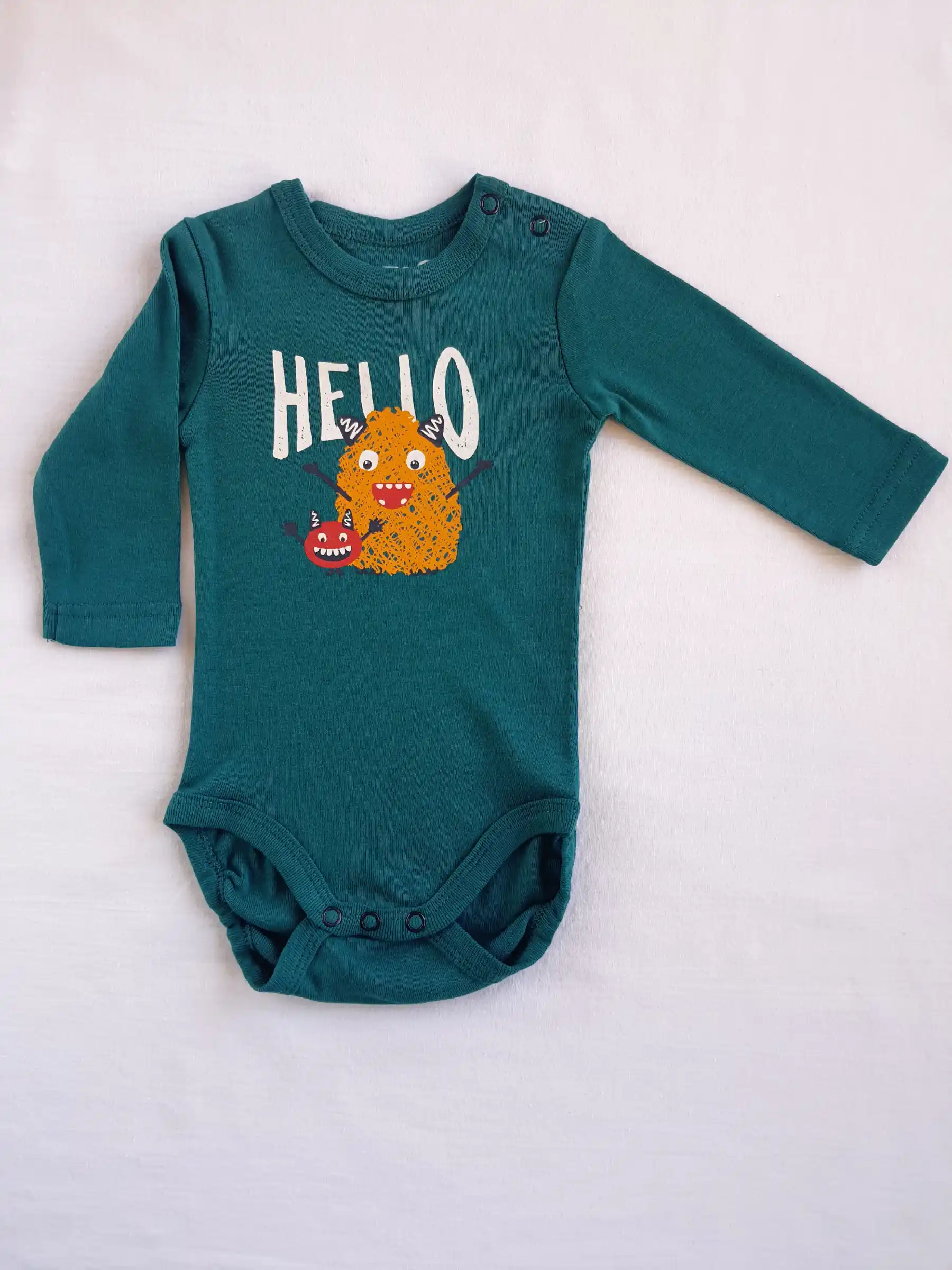 Βρεφικό κορμάκι με μακρύ μανίκι.Κατασκευασμένο από 100% βαμβακερό ύφασμα με πιστοποίηση STANDARD 100 by OEKO-TEX, που είναι φιλικό και ασφαλές προς το βρεφικό δέρμα. Ιδανικό για καθημερινή χρήση καθώς πρoσφέρει άνεση και απαλότητα στο μωρό σας. Πρακτικό άνοιγμα με τρούκ στο λαιμό και στο κάτω μέρος για μεγαλύτερη ευκολία. Σε πράσινο χρώμα με χαριτωμένο τύπωμα τερατάκια. Με επιπλέον πιστοποίηση Bureau Veritas.