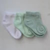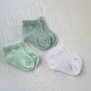 Σετ από 3 ζευγάρια βρεφικά καλτσάκια, κοντά, για μεγαλύτερη άνεση του μωρού σας. Κατασκευασμένα από ύφασμα με βάση το βαμβάκι αλλά και ελαστικό υλικό, που επιτρέπει στο βρεφικό δέρμα να αναπνέει. Κάθε ζευγάρι είναι μονόχρωμο, σε διαφορετική απόχρωση, ένα ζευγάρι σε χρώμα μέντα, ένα ζευγάρι σε βεραμάν χρώμα και ένα ζευγάρι σε λευκό χρώμα.