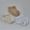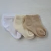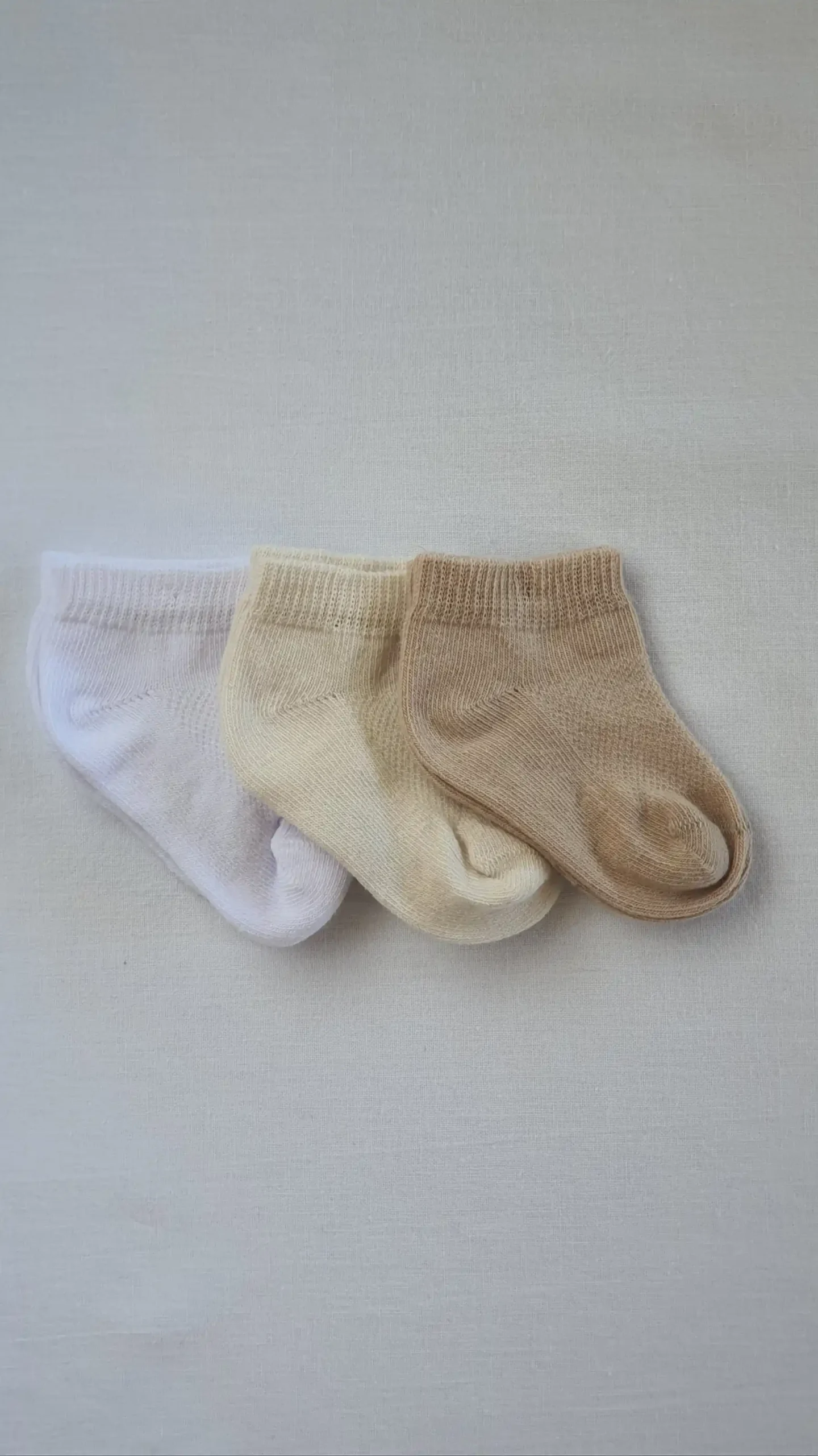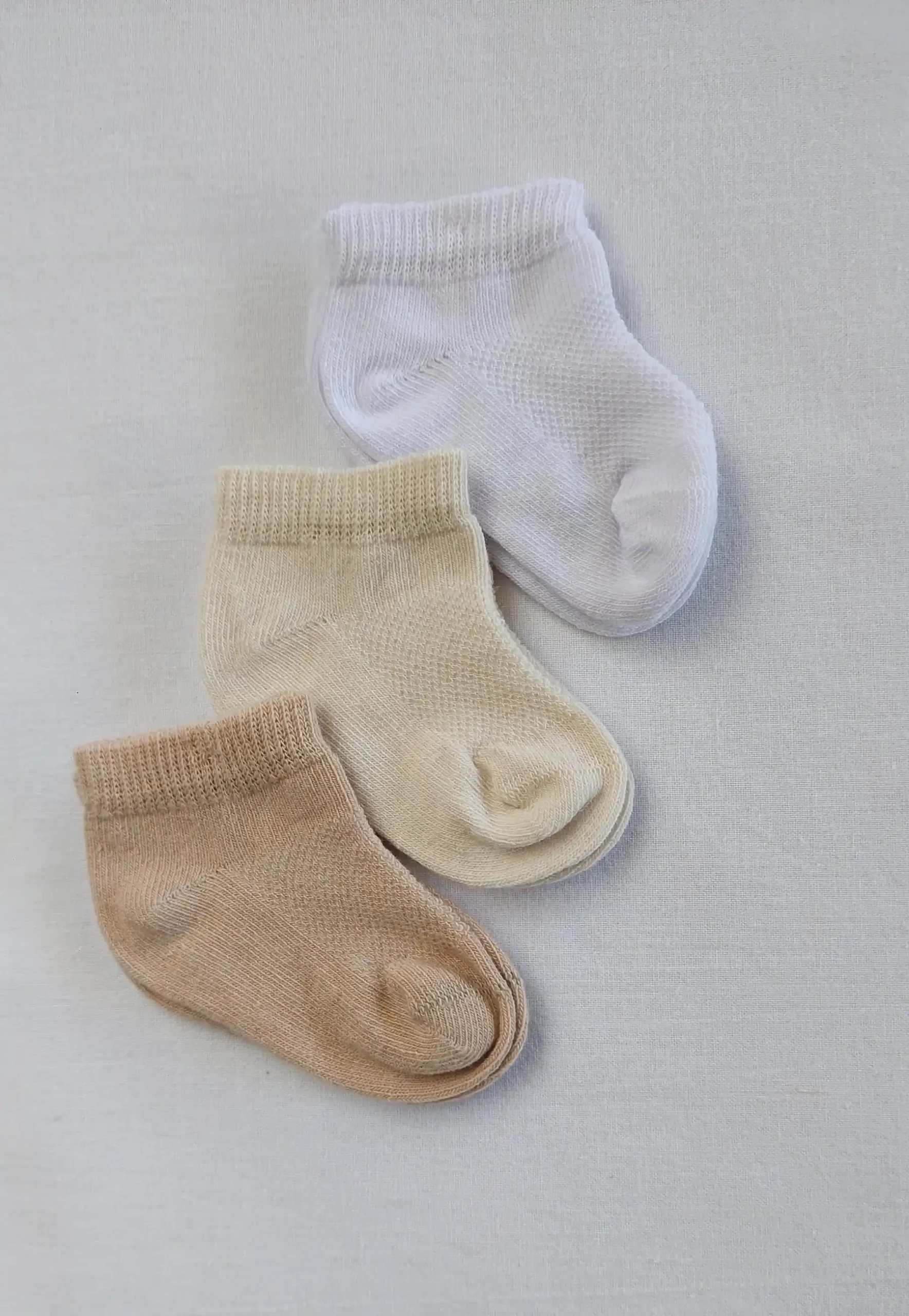 Σετ από 3 ζευγάρια βρεφικά καλτσάκια, κοντά, για μεγαλύτερη άνεση του μωρού σας. Κατασκευασμένα από ύφασμα με βάση το βαμβάκι αλλά και ελαστικό υλικό, που επιτρέπει στο βρεφικό δέρμα να αναπνέει. Κάθε ζευγάρι είναι μονόχρωμο, σε διαφορετική απόχρωση, ένα ζευγάρι σε μπεζ χρώμα, ένα ζευγάρι σε εκρού χρώμα και ένα ζευγάρι σε λευκό χρώμα.