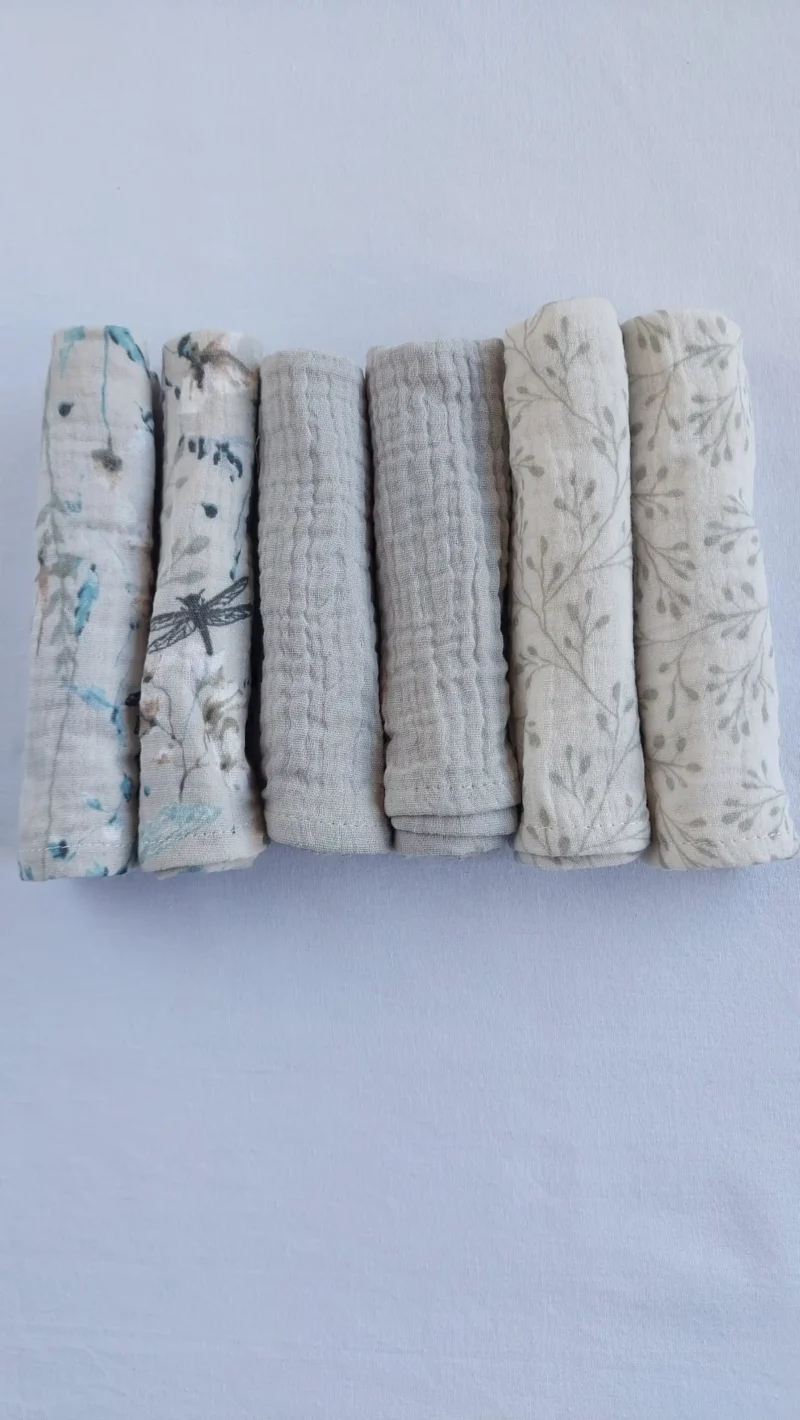 Σετ απο 6 τεμάχια απαλές λαβέτες μουσελίνας – πανάκια παρηγοριάς, από βαμβακερό ύφασμα. Σε πρακτική μικρή διάσταση, ιδανικές για την καθημερινή φροντίδα του μωρού σας. Το σετ περιλαμβάνει 2 μονόχρωμες μουσελίνες και 4 με σχέδια λουλούδια, σε κουτί δώρου.