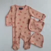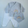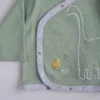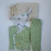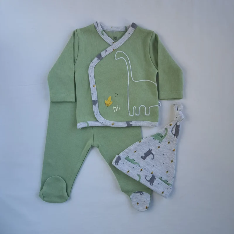 Σετ νεογέννητου σε συσκευασία δώρου βαμβακερό πουγκί. Κατασκευασμένο από 100% βαμβακερό ύφασμα που είναι φιλικό και ασφαλές προς το βρεφικό δέρμα. Αποτελείται από ένα μακρυμάνικο κρουαζέ ζακετάκι με κλείσιμο τρουκ στο πλάι, ένα παντελονάκι με κλειστό ποδαράκι και ένα σκουφάκι με δέσιμο κόμπο. Το σκουφάκι είναι σε γκρι μελανζέ χρώμα με σχέδιο dino, και το υπόλοιπο σετ είναι σε χρώμα μέντα. Το ζακετάκι είναι επίσης κεντημένο με σχέδιο dino. Το υφασμάτινο πουγκί σε μπεζ χρώμα είναι ιδανικό για τις ανάγκες των νέων γονιών, χάρη στις πολλές του χρήσεις. Αυτό το βρεφικό σετ είναι ιδανικό για τους πρώτους μήνες του μωρού σας, για την έξοδο από το μαιευτήριο αλλά και σαν δώρο, για baby shower, ή ακόμη και για την πρώτη σας συνάντηση με το νεογέννητο. Το μέγεθος είναι κατάλληλο για ύψος έως 50εκ.