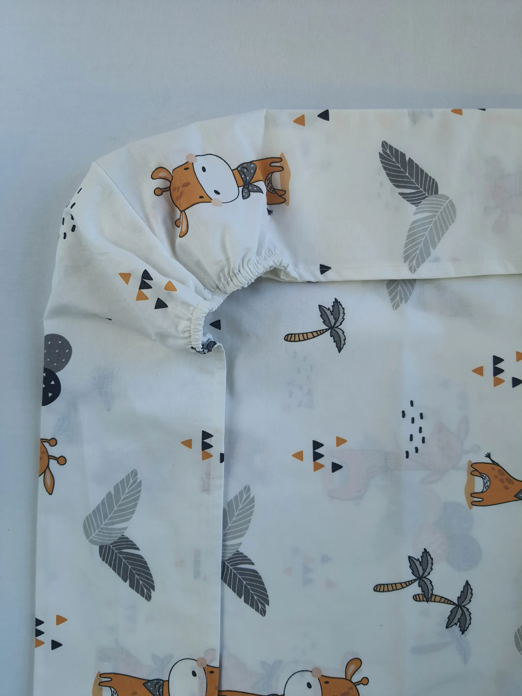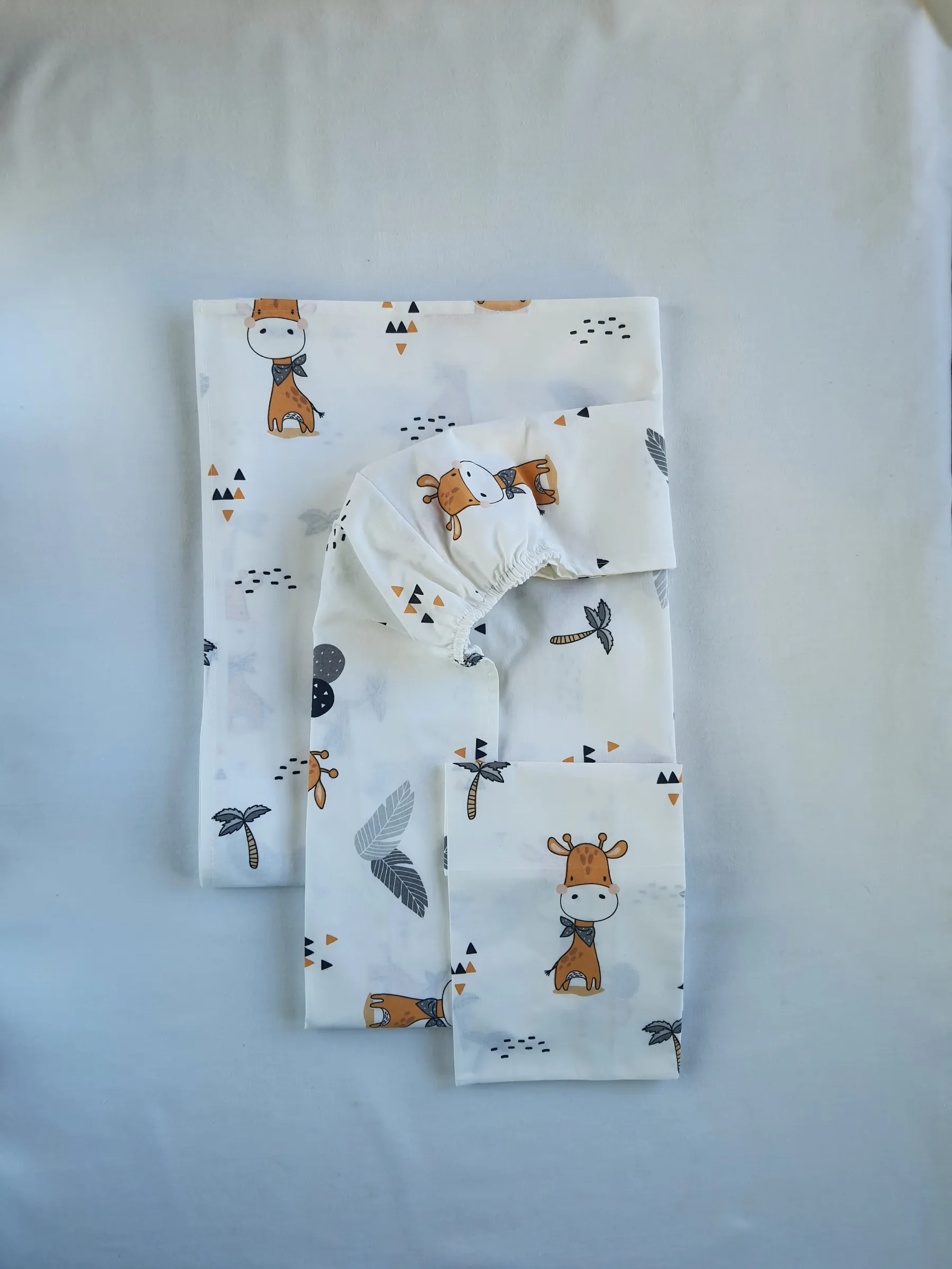 Σετ βρεφικά σεντόνια για κούνια μωρού 3 τεμαχίων. Αποτελείται από πανωσέντονο, μαξιλαροθήκη και κατωσέντονο με λάστιχο, για καλύτερη εφαρμογή στο στρώμα. Κατασκευασμένο από 100% βαμβακερό ύφασμα, ιδανικό για όλες τις εποχές καθώς επιτρέπει στο βρεφικό δέρμα να αναπνέει. Με απαλό ύφασμα και ευχάριστο σχέδιο, αυτό το σετ είναι ιδανικό για καθημερινή χρήση αλλά και ένα ξεχωριστό δώρο για baby shower, για το μαιευτήριο ή τη βάπτιση. Το σετ είναι σε λευκό χρώμα με σχέδιο καμηλοπάρδαλη σε γκρι και σκούρες κίτρινες αποχρώσεις.