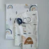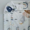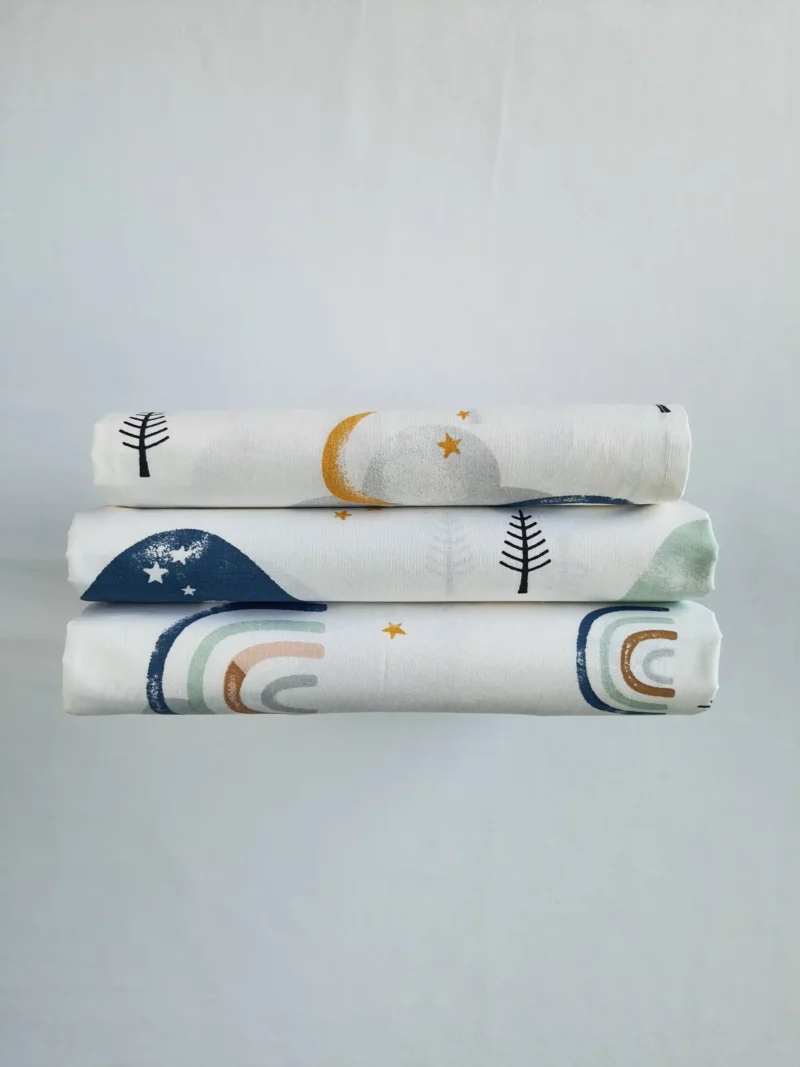 Σετ βρεφικά σεντόνια για κούνια μωρού 3 τεμαχίων. Αποτελείται από πανωσέντονο, μαξιλαροθήκη και κατωσέντονο με λάστιχο, για καλύτερη εφαρμογή στο στρώμα. Κατασκευασμένο από 100% βαμβακερό ύφασμα, ιδανικό για όλες τις εποχές καθώς επιτρέπει στο βρεφικό δέρμα να αναπνέει. Με απαλό ύφασμα και ευχάριστο σχέδιο, αυτό το σετ είναι ιδανικό για καθημερινή χρήση αλλά και ένα ξεχωριστό δώρο για baby shower, για το μαιευτήριο ή τη βάπτιση. Το σετ είναι σε λευκό χρώμα με σχέδιο ουράνιο τόξο σε μπλε αποχρώσεις.