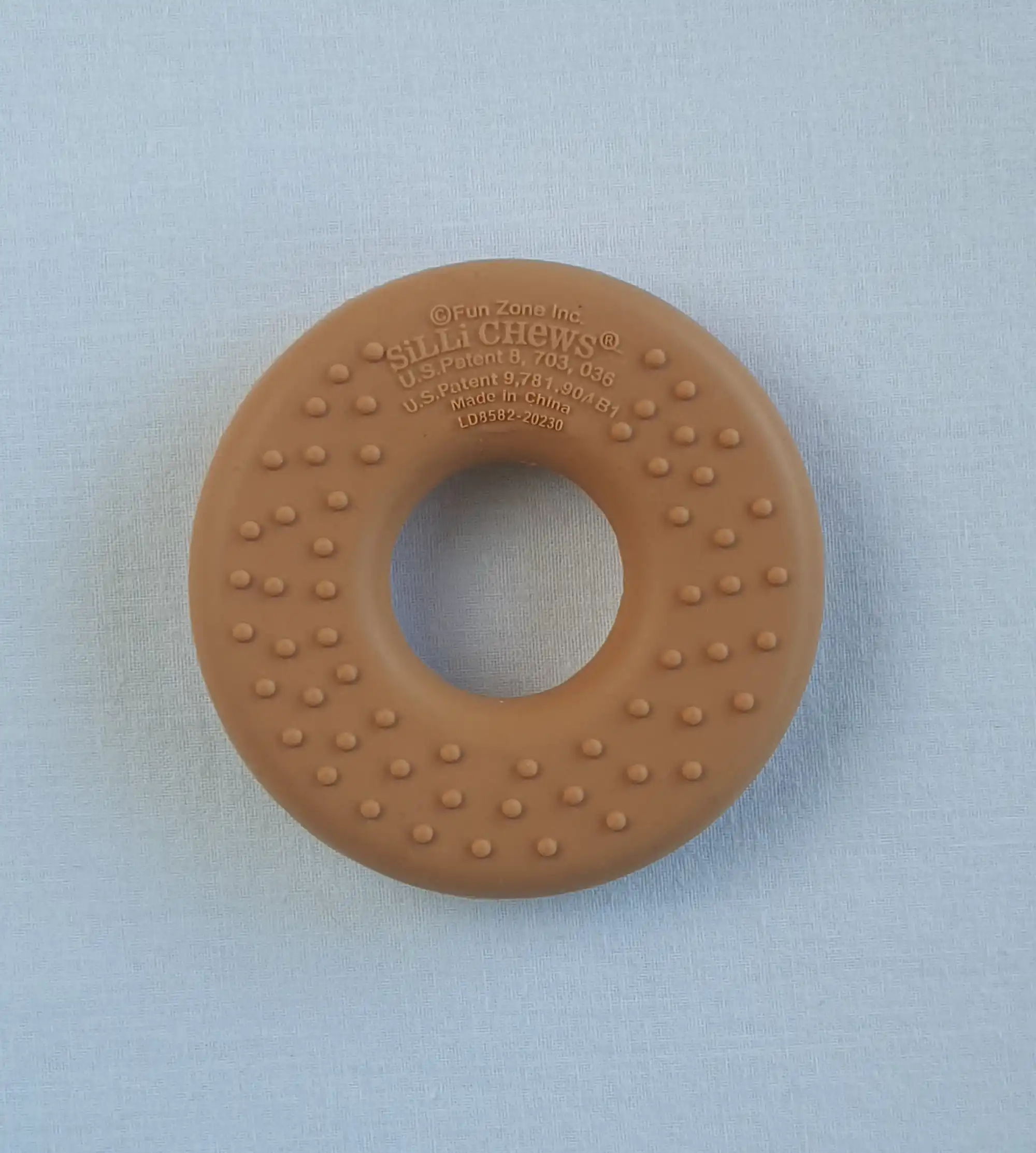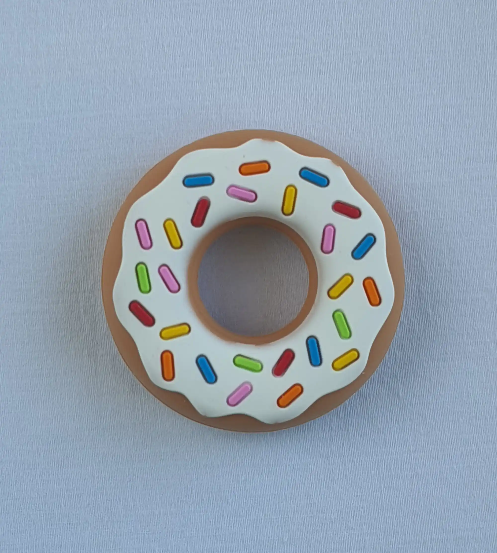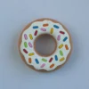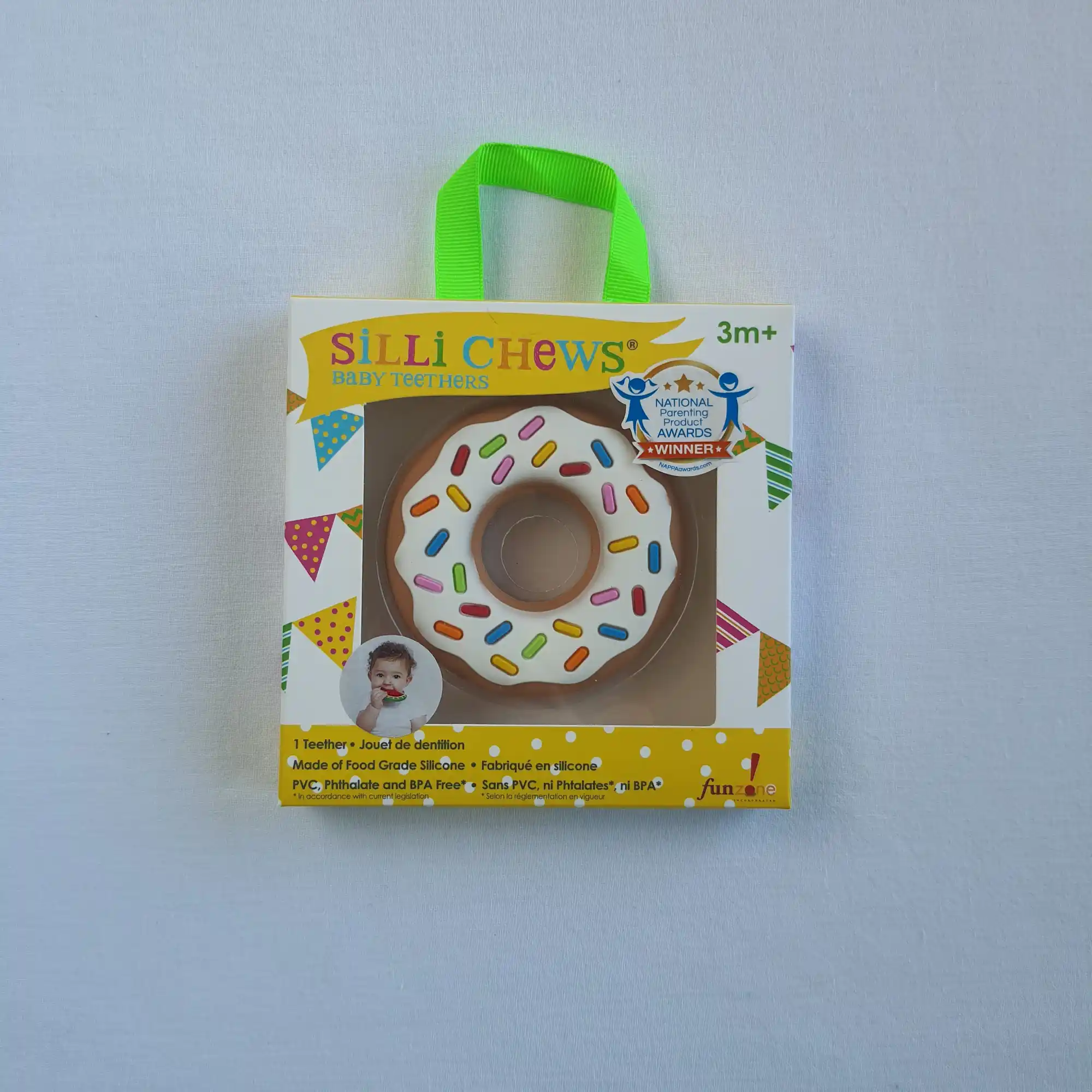 Μασητικό σε σχέδιο ντόνατ, ελαφρύ, μαλακό και με διαφορετικές επιφάνειες κατάλληλες για το τρίψιμο των ούλων του μωρού σας. Το ιδιαίτερο σχήμα και το έντονο χρώμα του τραβάει την προσοχή του και έχει άνοιγμα που ταιριάζει στα περισσότερα κλιπ πιπίλας. Ένα μασητικό με πατέντα, κατασκευασμένο από την Silli Chews στην Καλιφόρνια, από 100%σιλικόνη κατάλληλη για τρόφιμα. Χωρίς επιπλέον χρώματα ή βλαβερές ουσίες, με πιστοποιήσεις CPSIA, ASTM ,EN71 και χωρίς BPA, PVC και φθαλικά. Πλένεται στο χέρι με ζεστό νερό και σαπούνι, ή στο πάνω ράφι στο πλυντήριο πιάτων. Μην το βράσετε. Συσκευασμένο σε κουτί δώρου.