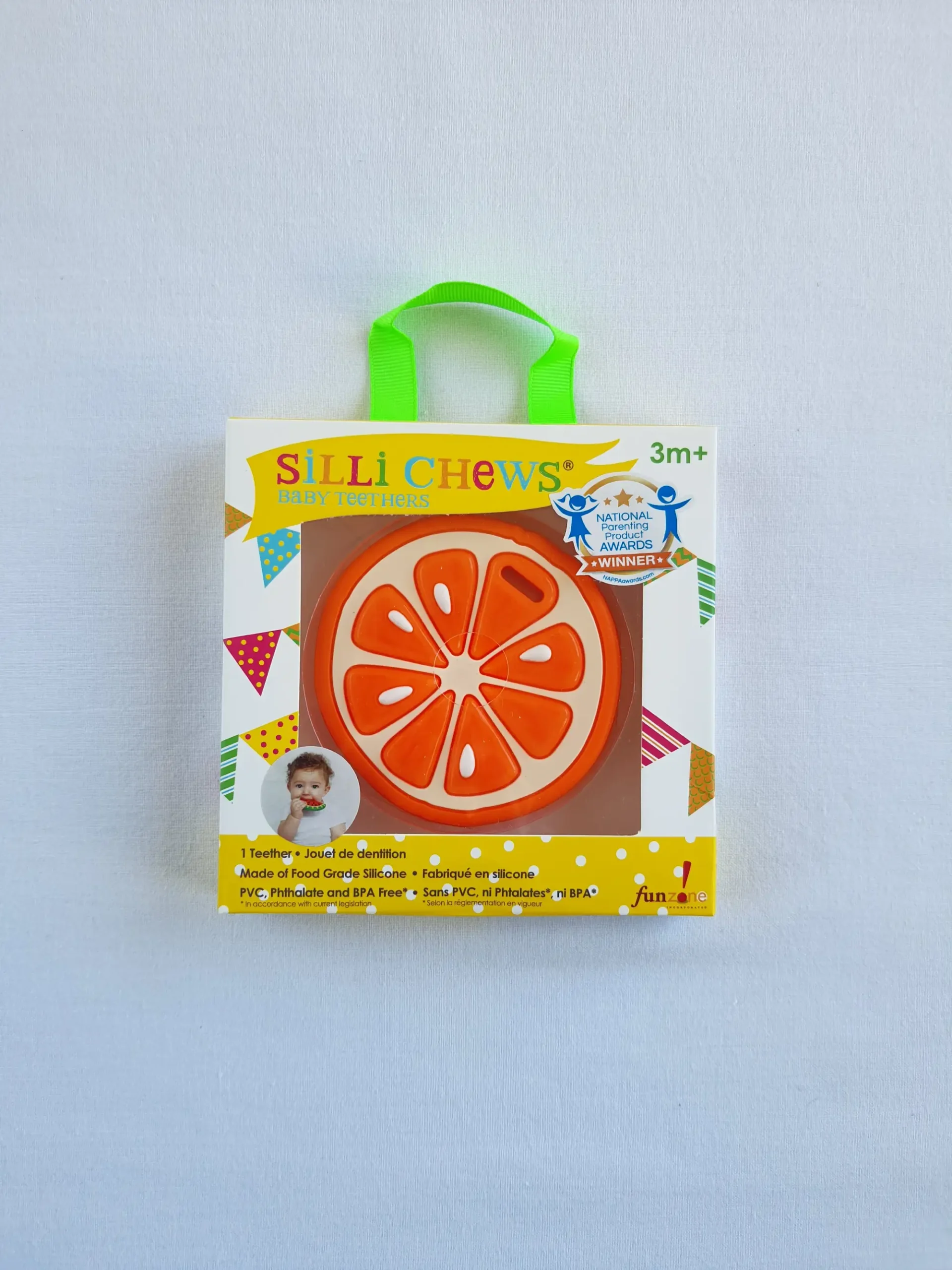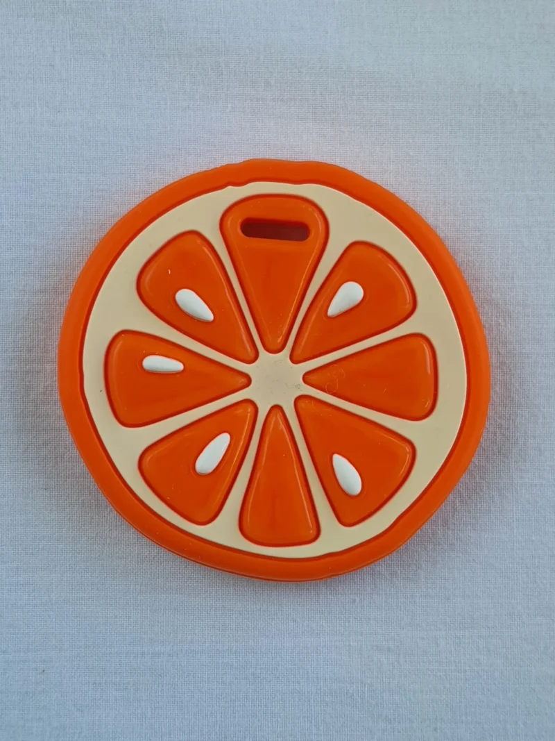 Μασητικό σε σχέδιο Πορτοκάλι, ελαφρύ, μαλακό και με διαφορετικές επιφάνειες κατάλληλες για το τρίψιμο των ούλων του μωρού σας. Το ιδιαίτερο σχήμα και το έντονο χρώμα του τραβάει την προσοχή του και έχει άνοιγμα που ταιριάζει στα περισσότερα κλιπ πιπίλας. Ένα μασητικό με πατέντα, κατασκευασμένο από την Silli Chews στην Καλιφόρνια, από 100%σιλικόνη κατάλληλη για τρόφιμα. Χωρίς επιπλέον χρώματα ή βλαβερές ουσίες, με πιστοποιήσεις CPSIA, ASTM ,EN71 και χωρίς BPA, PVC και φθαλικά. Πλένεται στο χέρι με ζεστό νερό και σαπούνι, ή στο πάνω ράφι στο πλυντήριο πιάτων. Μην το βράσετε. Συσκευασμένο σε κουτί δώρου.